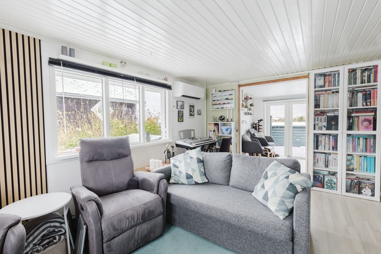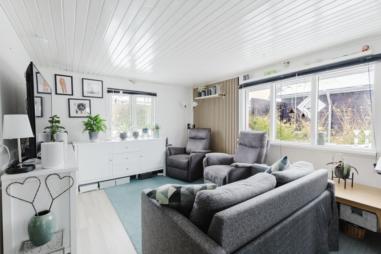Sommerhuset byder på en lys og indbydende stue med gode vinduespartier, som sikrer et behageligt lysindfald og en rar atmosfære. Stuen ligger i åben forbindelse med køkkenet, hvilket skaber et naturligt samlingspunkt med plads til både afslapning og samvær.