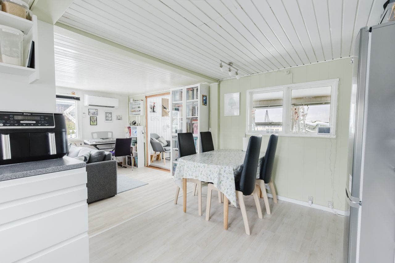 Køkkenet fremstår funktionelt og pænt indrettet med god bord- og skabsplads, og her er der nem adgang til spisepladsen. Planløsningen er veludnyttet og rummer desuden soveværelse, entré samt badeværelse. Derudover er der et godt og anvendeligt disponibelt rum.