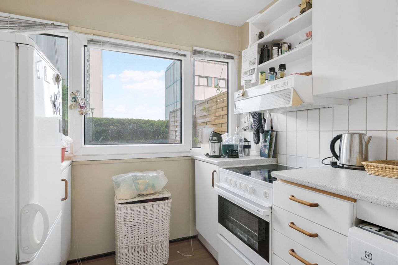 Boligen, der fremstår i pæn og lys stand, opvarmes med økonomisk fjernvarme.