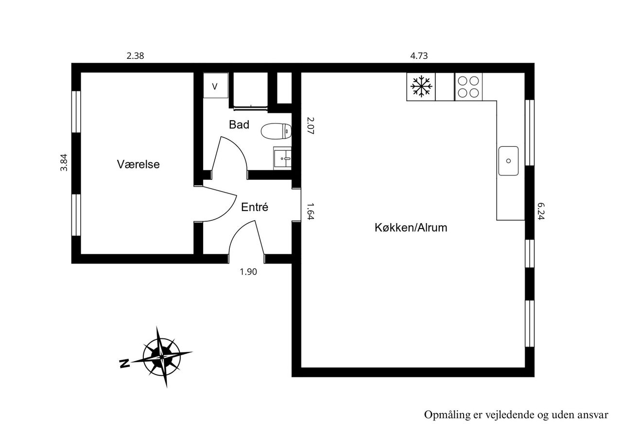 Lejligheden indeholder: Entré, badeværelse med bruseniche og plads til vaskemaskine, soveværelse som kan rumme mindre kontorplads, opholdsstuen er sammen med køkkenet, hvor der er plads til spisebord og sofagruppe.