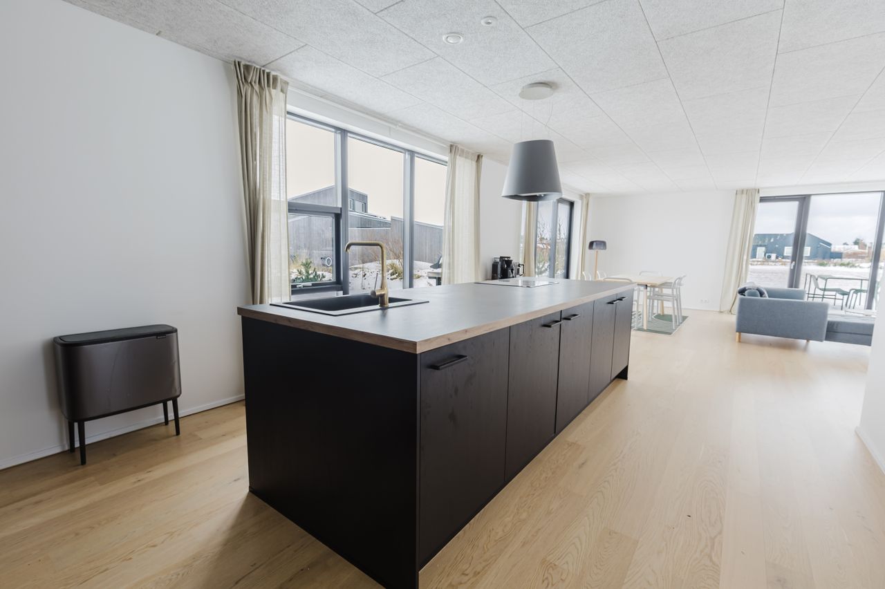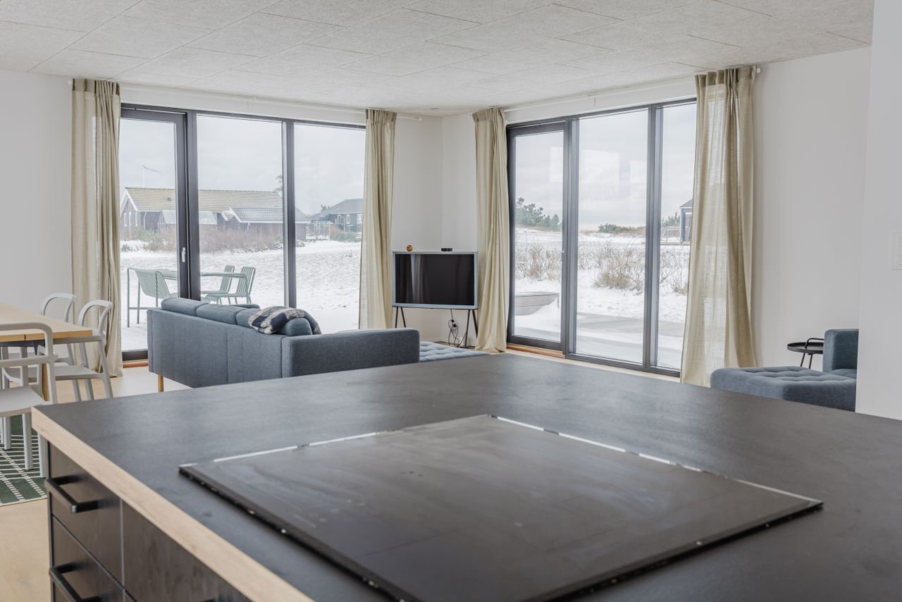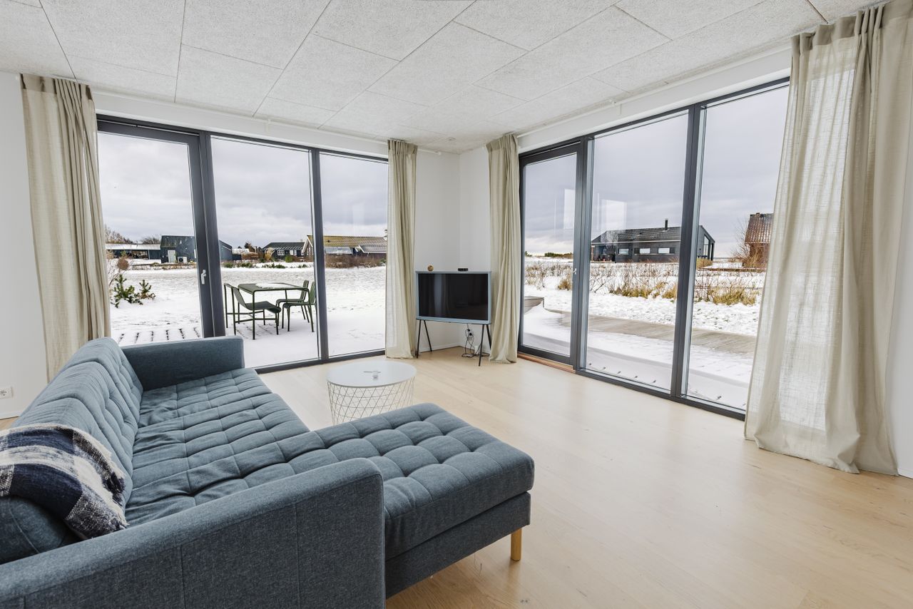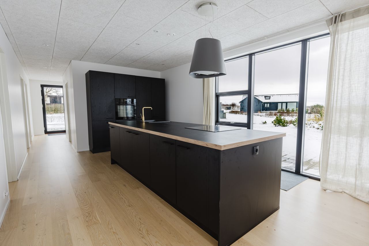 Materialevalget er lyst og tidløst med lyse gulve og hvide vægge, som understreger den rolige sommerhusstemning. De store glaspartier giver et dejligt kig til omgivelserne og masser af dagslys året rundt.