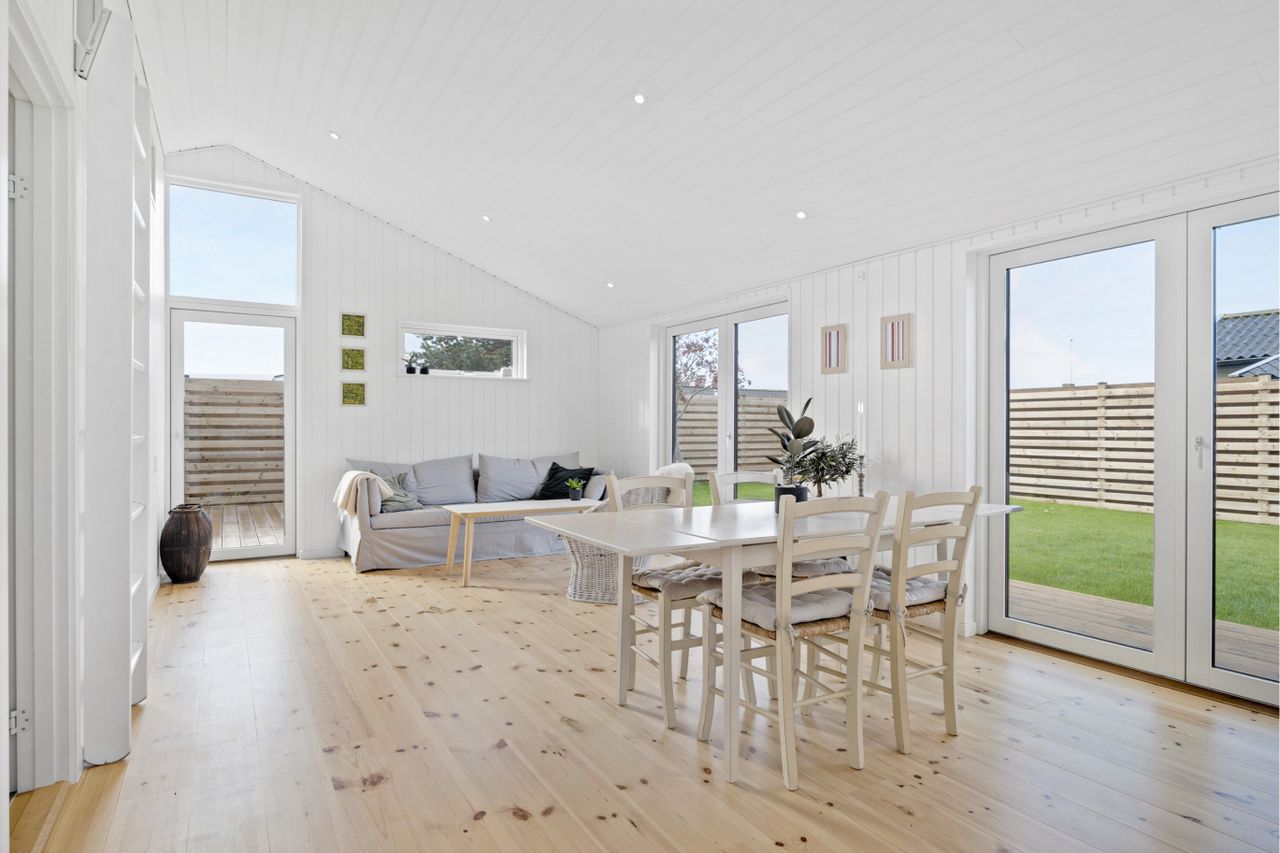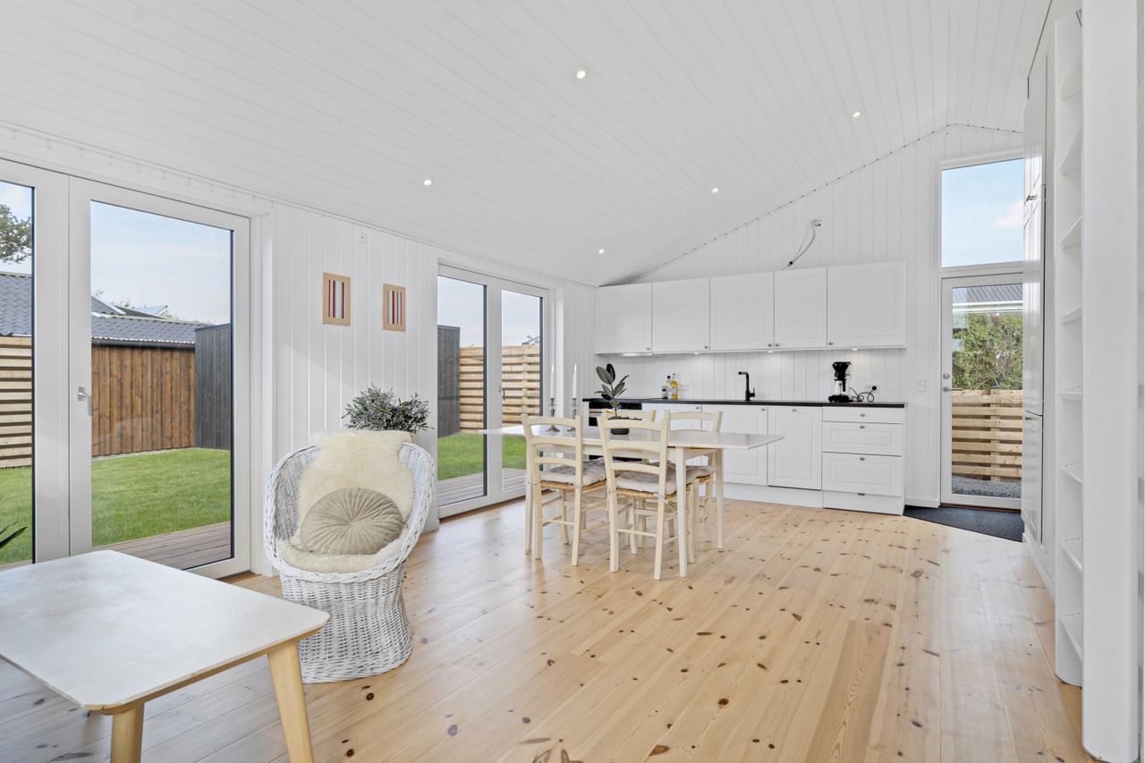 Alt er indrettet i lyse og indbydende farver og materialer og fritidshuset fremstår særdeles rummeligt og