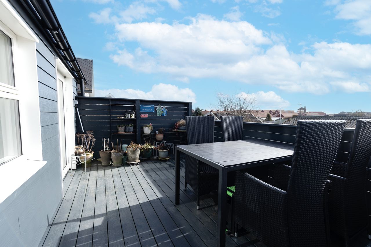 En ekstra kvalitet ved huset er den 15m2 store forhøjede og ugenerte træterrasse hvor man har kig til Smålandshavet og udsigt over Vesterhave.