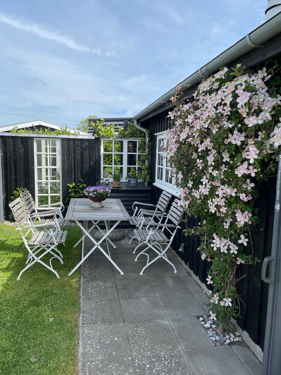 Huset er beliggende på egen grund, som støder op til grønne arealer på to af siderne. Græsplænen og terrasserne sørger for en rigtig hyggelig haveoplevelse.